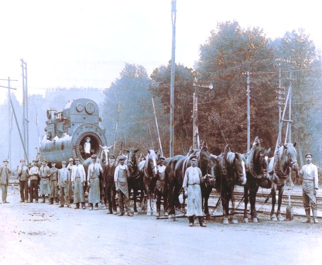 Das Großfoto vom Weischlitzer Fotografen Fritz Hohberg zeigt den Antransport einer der Dampfmaschinen auf dem Bahnhof Pirk. Die großen Schwungräder waren zum Transport abmontiert. Sie sind auf der nebenstehenden Werbung der Firma Lanz gut zu erkennen.