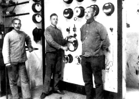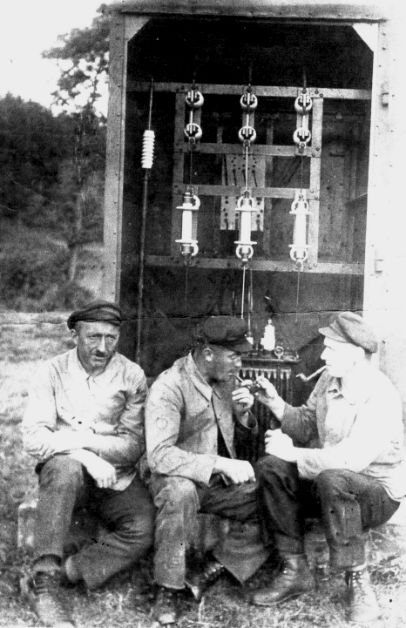 Foto: Drei Monteure vor einer kleinen Trafostation, ihre Namen sind nicht bekannt.