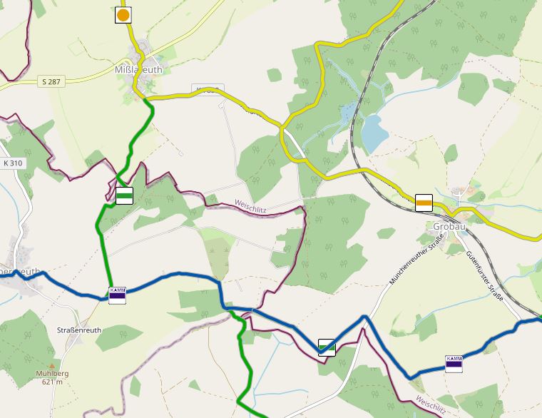 Wieder auf den Kammweg führt der Weg nun immer linksseits des ehemaligen KFZ-Sperrgrabens auf einem Kolonnenweg (Grenzsicherungsweg der ehemaligen innerdeutschen Grenze) bis Gutenfürst. Von dort führt der Weg über Grobau immer linksseitig der Bahnstrecke Plauen – Hof. In Grobau unterqueren wir die historische Eisenbahnbrücke. Von hier aus sind es noch 3 km bis zum Ziel immer entlang der Straße.